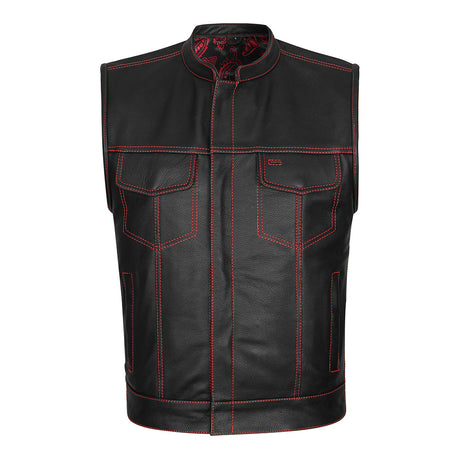 Leather Universe 522 Red Stitch Biker Vest with Black and Red Bandana Liner