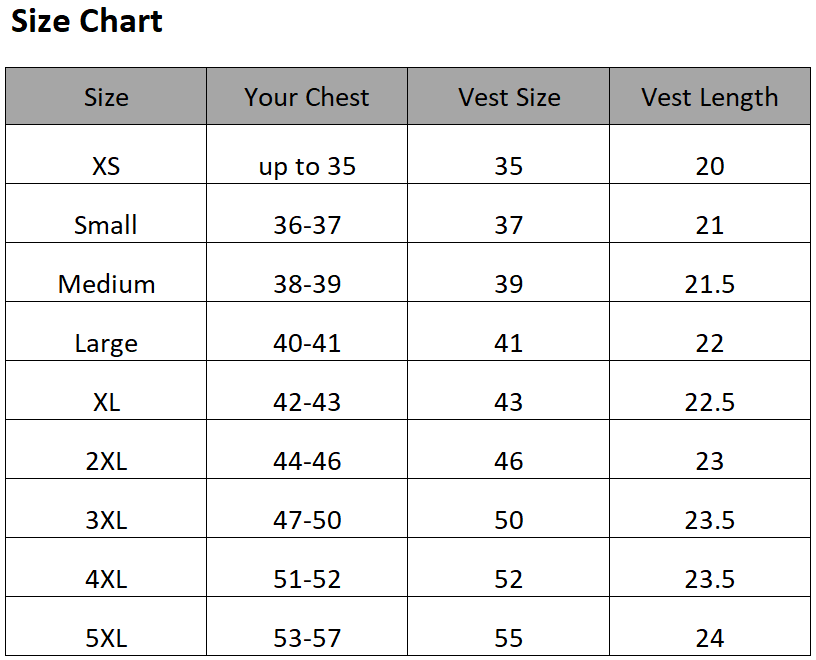 | Size | Your Chest | Vest Chest | Vest Length |