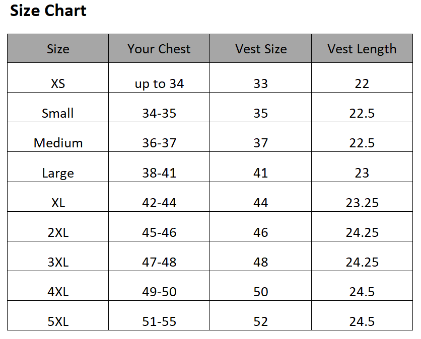| Size | Your Chest | Vest Chest | Vest Length |