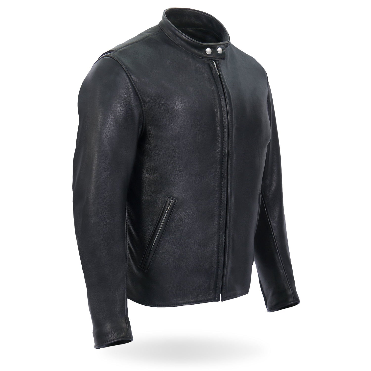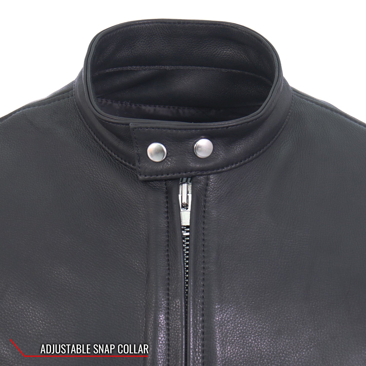 A durable, USA made high quality genuine leather men's jacket designed with a snap collar, snap pockets, zipper pockets, a zipper closure on the front with zippers on the back panel.
