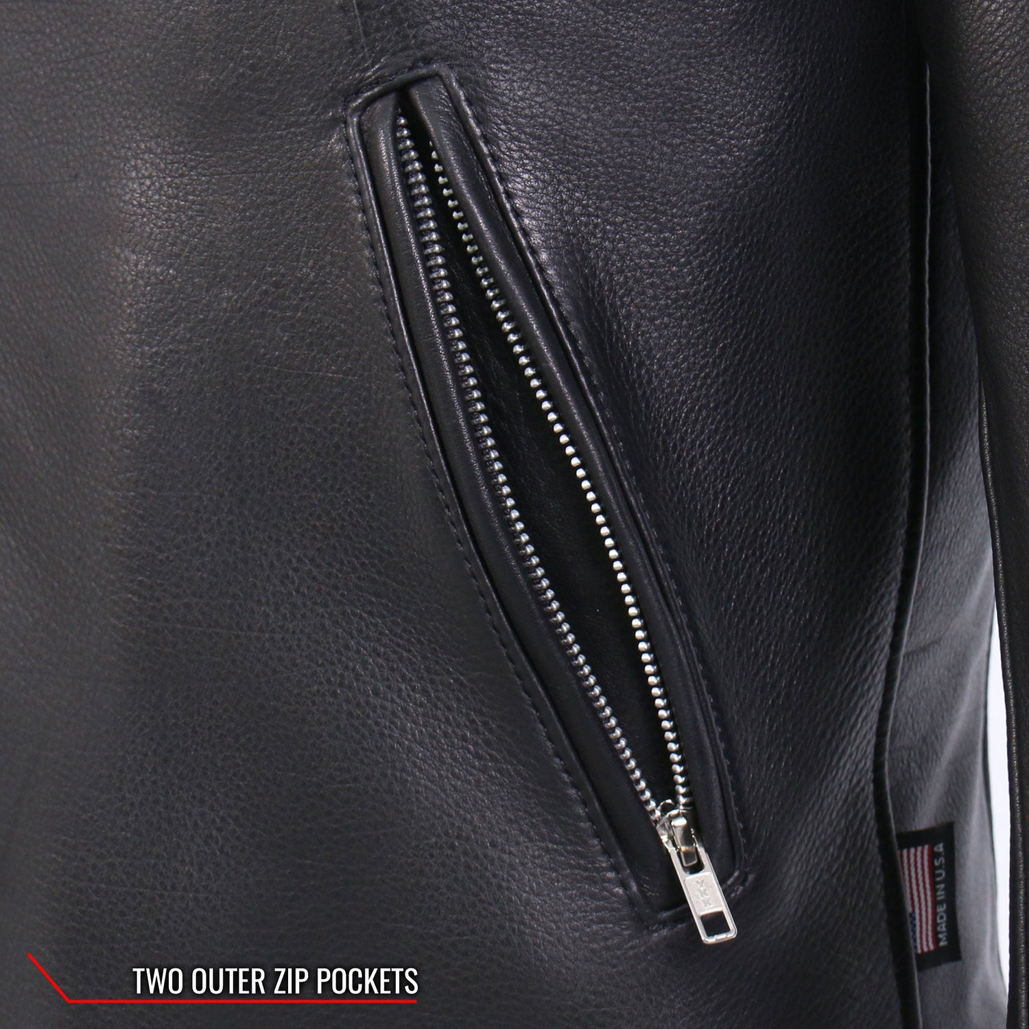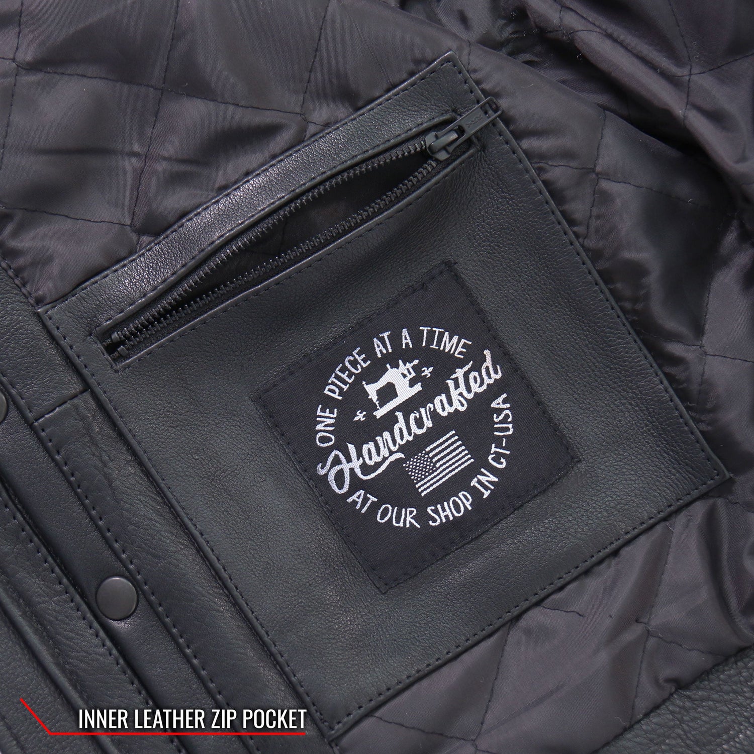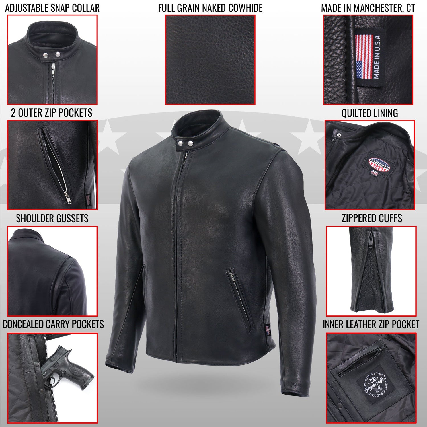 This jacket is handcrafted in the USA using the highest quality thread, providing extremely durable and long lasting seams. All hardware on this men's jacket is black, including the YKK zippers on all zip closure and the heavy duty snap closure on the collar. This jacket also features two outside zip pockets lined with leather and two conceal carry inside pockets with snap closure, in addition to a quilted lining for added comfort when needed.