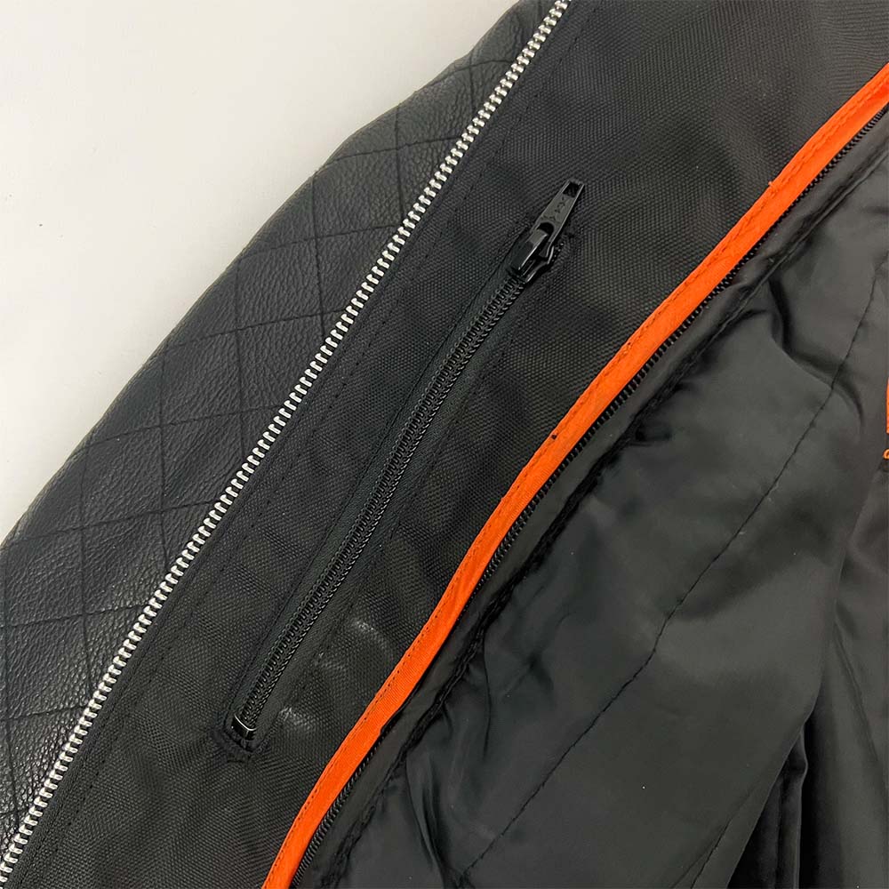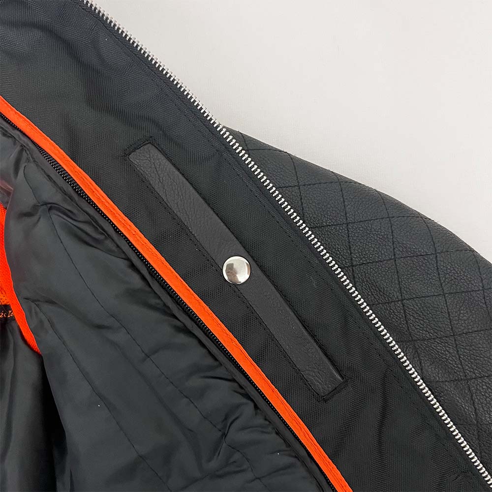 - Two inside pockets, one snap closure (left), one zipper closure (right)