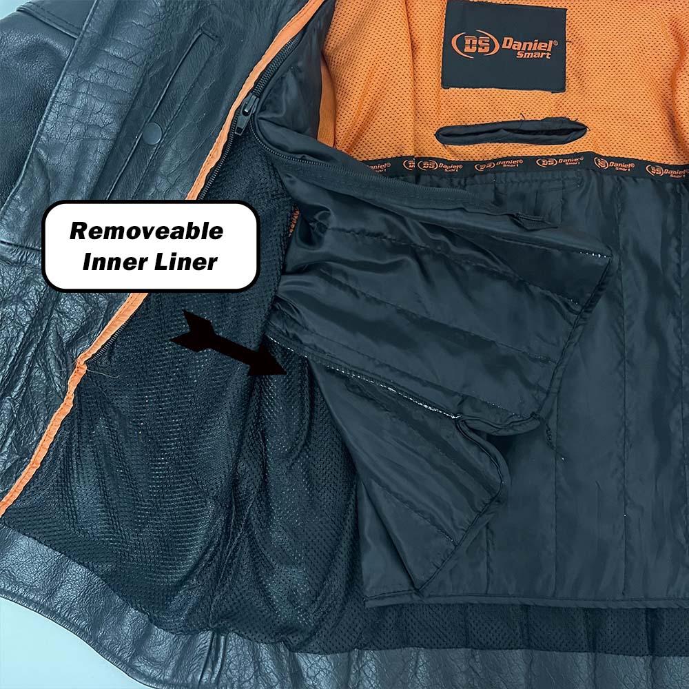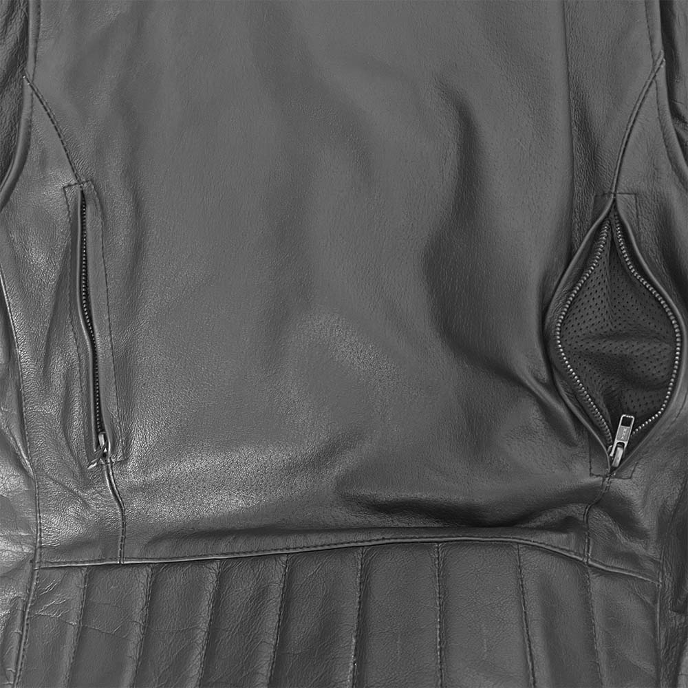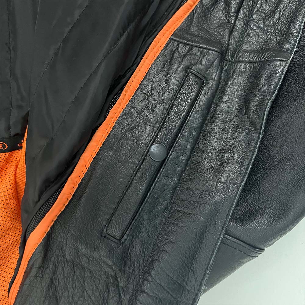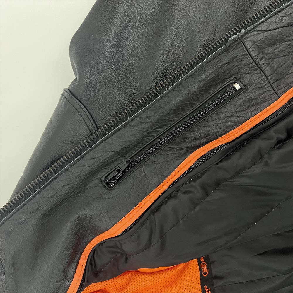 - Two inside pockets, one snap closure (left), one zipper closure (right)