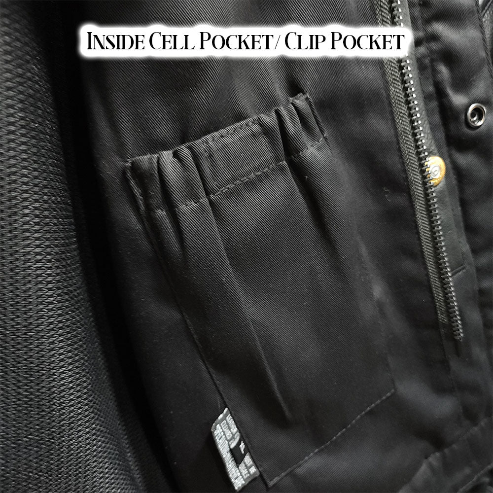 - 2 inside concealed carry pockets made of special heavy duty textile with built-in holsters and two bullet snap closures per pocket